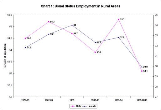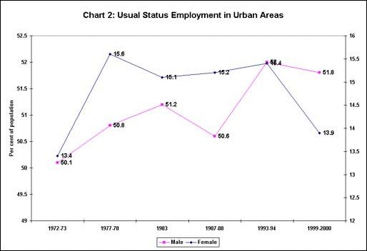 Thus, as Chart 1 shows, the per cent of rural population, both male and female, showing some usual status employment, has not only declined over the 1990s, but in 1999-2000 was at the lowest level in thirty years. Even in urban areas, as shown in Chart 2, there is evidence of decline since 1993-94, although the levels are not the lowest over the period as in rural areas.